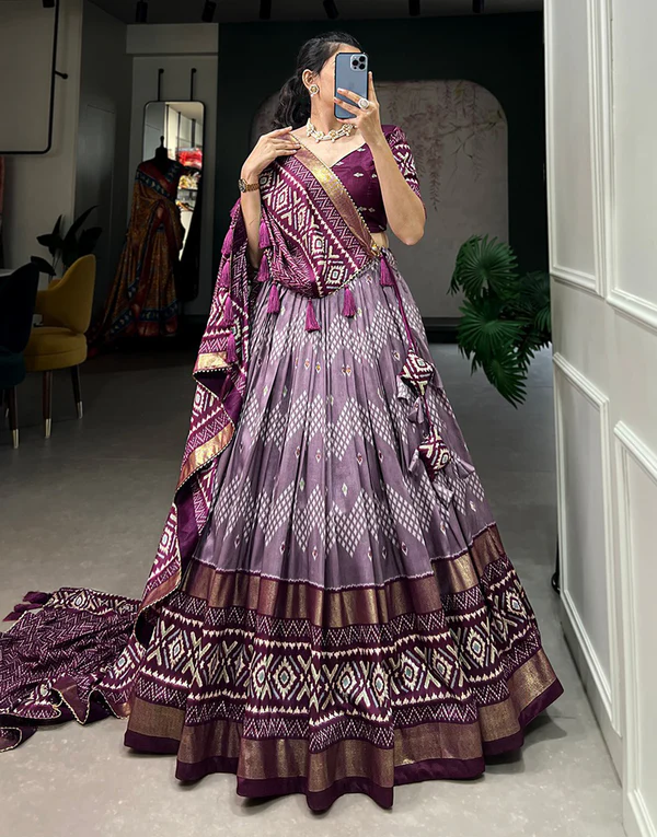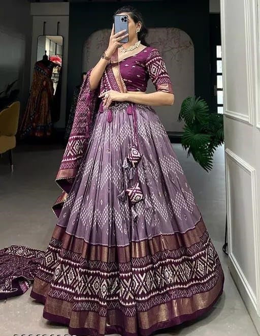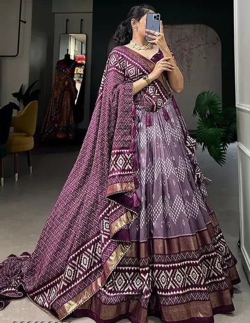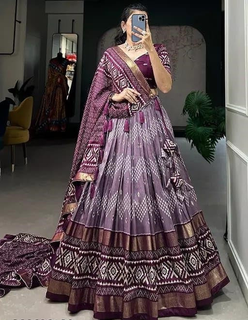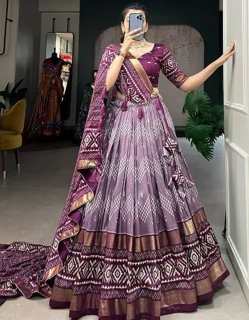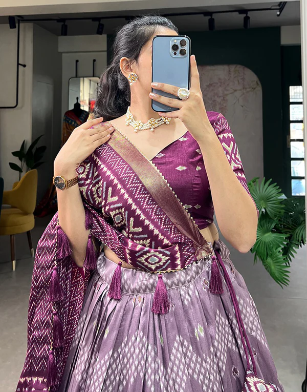 Embrace the festive spirit with this stunning -colored tussar silk Navratri lehenga choli. Adorned with intricate floral and patola prints, the lehenga boasts a luxurious sheen and a graceful flare. Paired with an unstitch blouse in matching color, ready for customization to your style, this ensemble offers both elegance and tradition. Perfect for celebrating Navratri, it promises to make you stand out with its rich hues and cultural motifs.