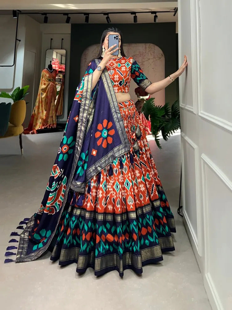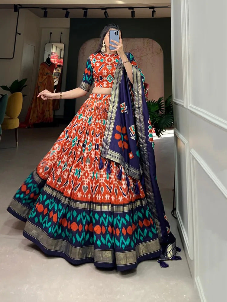 Lehenga Choli For Womens And Girls Tussar Silk Fabric With Orange Color Patola Print With Foil work Speciel Events Chaniya Choli Set.