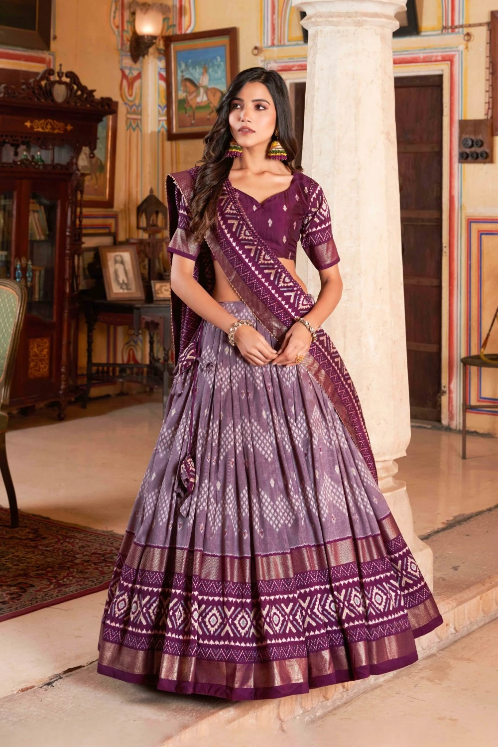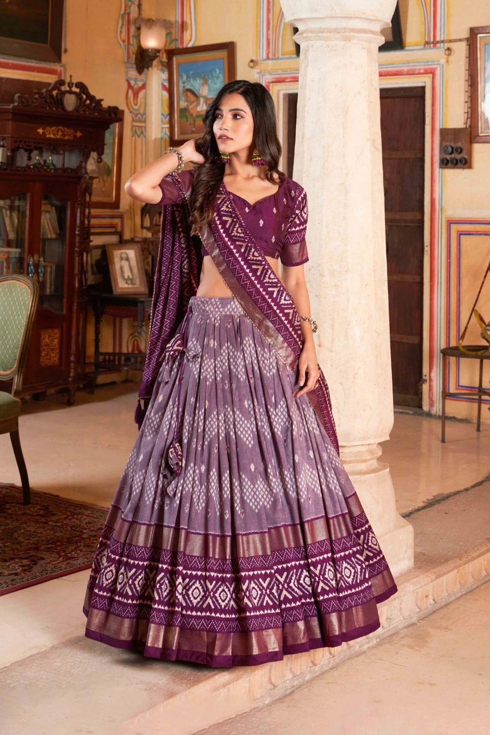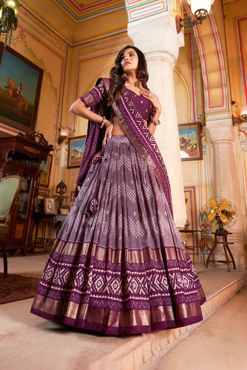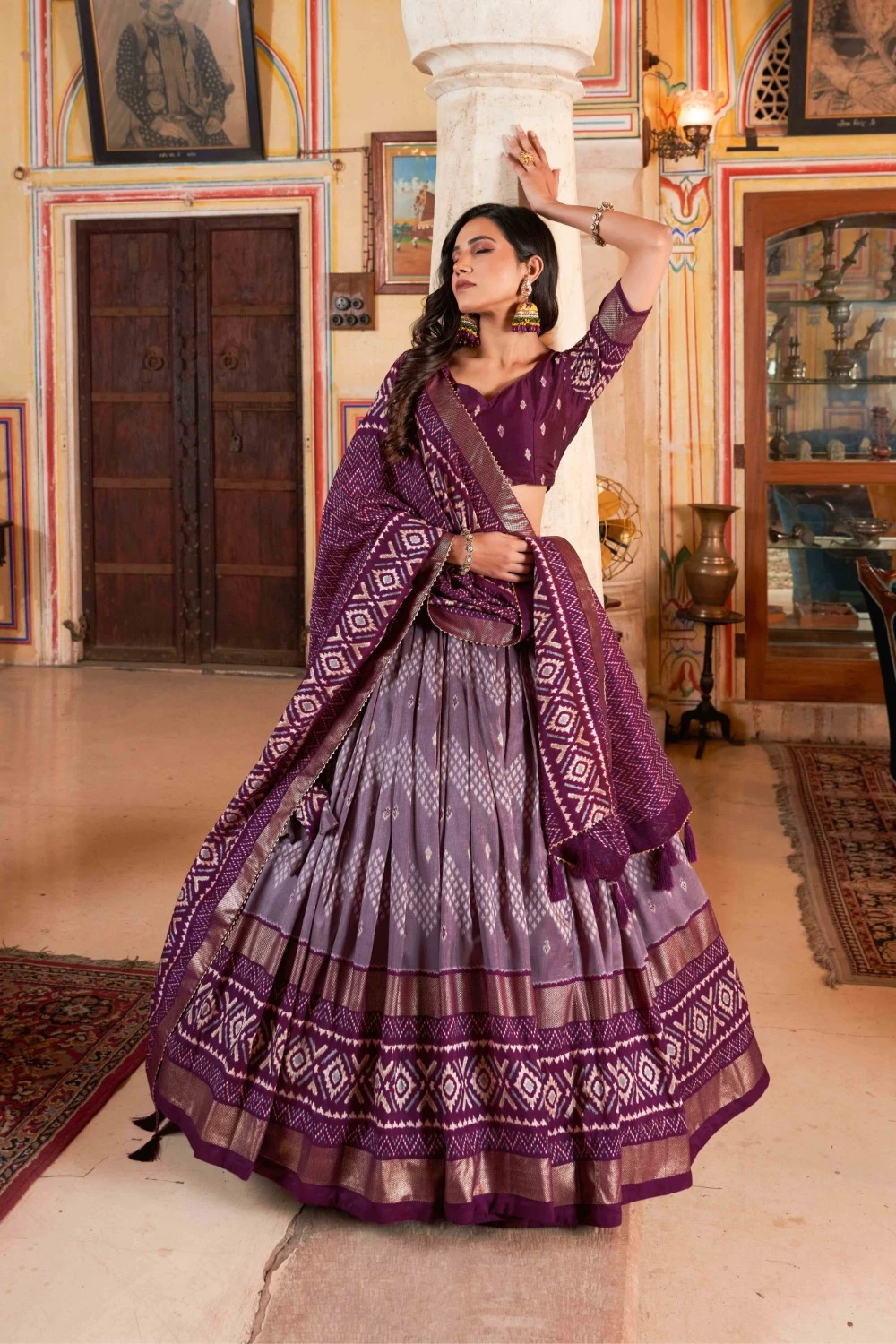 Wine Color Dot And Ikkat Print With Foil Work Tussar Silk Lehenga Choli.