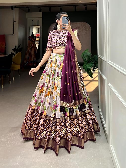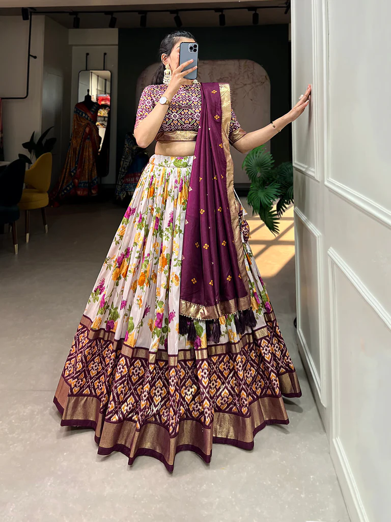 Dressed up with this captivating wine color lehenga crafted with tussar silk material and completed with floral and patola printed with foil work.